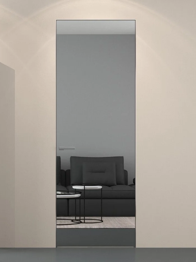 Каркасная дверь Hausdoors с зеркалом на лицевой части, с другой стороны под покраску, открывание наружу. Полотна изготавливаются с фабричной фрезеровкой под замок 196 мм и петли AGB Eclipse 2.2. Со стороны зеркала предусмотрено одно или два отверстия - под ручку и фиксатор/цилиндр. Рекомендуется к установке ручка на круглой розетке диаметром не менее 52 мм.