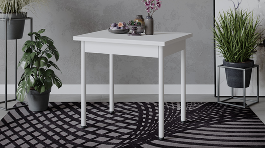 Стол имеет поворотно-раскладной механизм трансформации. Длина стола увеличивается вдвое: для этого нужно развернуть столешницу на 90 градусов и опустить верхнее крыло.