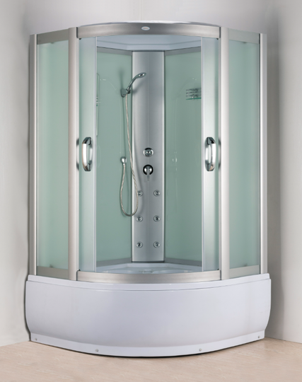 - Комплектация: верхний душ, 6 гидромассажных форсунок, ручной душ с держателем, стеклянная полка, зеркало.