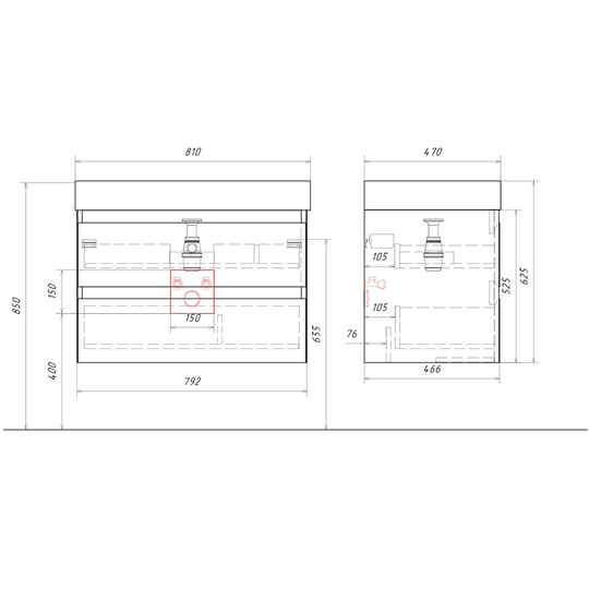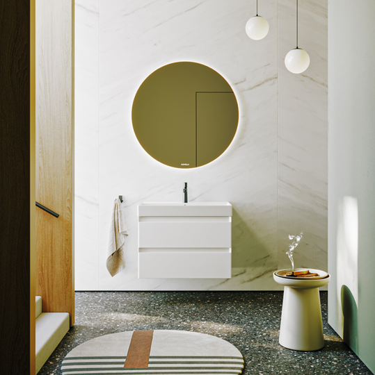 Тумба Aqwella Geometria 80 оснащена двумя выдвижными ящиками на направляющих скрытого монтажа, что обеспечивает плавное скольжение и мягкое закрывание. Фасады и боковины с обработкой торцов под углом 45 градусов создают лаконичность и изящный, почти монолитный силуэт в закрытом состоянии. Все грани имеют округлую фрезеровку, обеспечивая приятные тактильные ощущения при открывании. Внутри ящиков - отделка под светлый камень, боковины выполнены из толстого тонированного стекла, что добавляет коллекции элегантности.