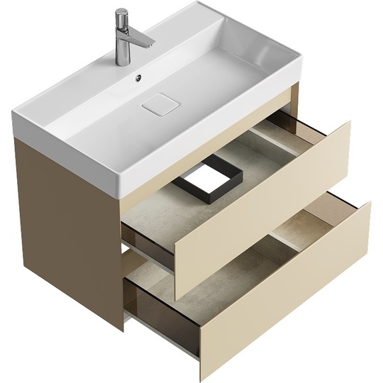 Тумба Aqwella Geometria 80 оснащена двумя выдвижными ящиками на направляющих скрытого монтажа, что обеспечивает плавное скольжение и мягкое закрывание. Фасады и боковины с обработкой торцов под углом 45 градусов создают лаконичность и изящный, почти монолитный силуэт в закрытом состоянии. Все грани имеют округлую фрезеровку, обеспечивая приятные тактильные ощущения при открывании. Внутри ящиков - отделка под светлый камень, боковины выполнены из толстого тонированного стекла, что добавляет коллекции элегантности.