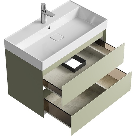 Тумба Aqwella Geometria 80 оснащена двумя выдвижными ящиками на направляющих скрытого монтажа, что обеспечивает плавное скольжение и мягкое закрывание. Фасады и боковины с обработкой торцов под углом 45 градусов создают лаконичность и изящный, почти монолитный силуэт в закрытом состоянии. Все грани имеют округлую фрезеровку, обеспечивая приятные тактильные ощущения при открывании. Внутри ящиков - отделка под светлый камень, боковины выполнены из толстого тонированного стекла, что добавляет коллекции элегантности.