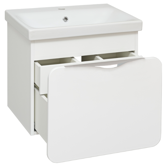 Тумба Skandi 60 оснащена двумя ящиками: внешним и внутренним. Внешний ящик на направляющих скрытого монтажа с доводчиком. Внутренний открывается с помощью механизма Push-to-Open. Корпус тумбы выполнен из ЛДСП, а фасад внешнего ящика - из МДФ. Лаконичным завершением общей композиции является стильная хромированная ручка.