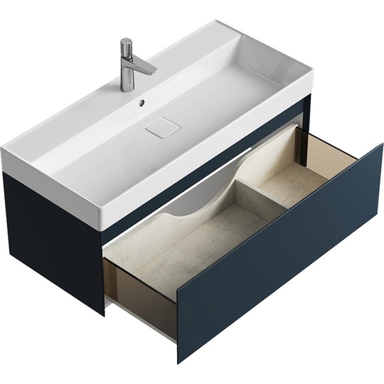 Тумба Aqwella Geometria 100 оснащена одним выдвижным ящиком на направляющих скрытого монтажа, что обеспечивает плавное скольжение и мягкое закрывание. Фасады и боковины с обработкой торцов под углом 45 градусов создают лаконичность и изящный, почти монолитный силуэт в закрытом состоянии. Все грани имеют округлую фрезеровку, обеспечивая приятные тактильные ощущения при открывании. Внутри ящиков - отделка под светлый камень, боковины выполнены из толстого тонированного стекла, что добавляет коллекции элегантности.