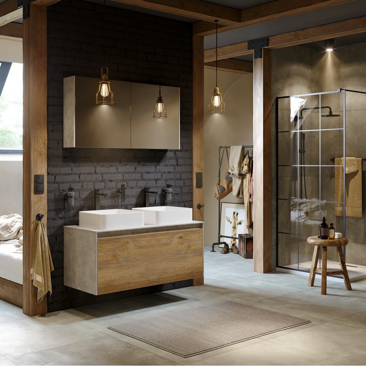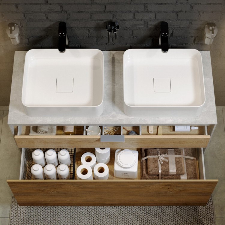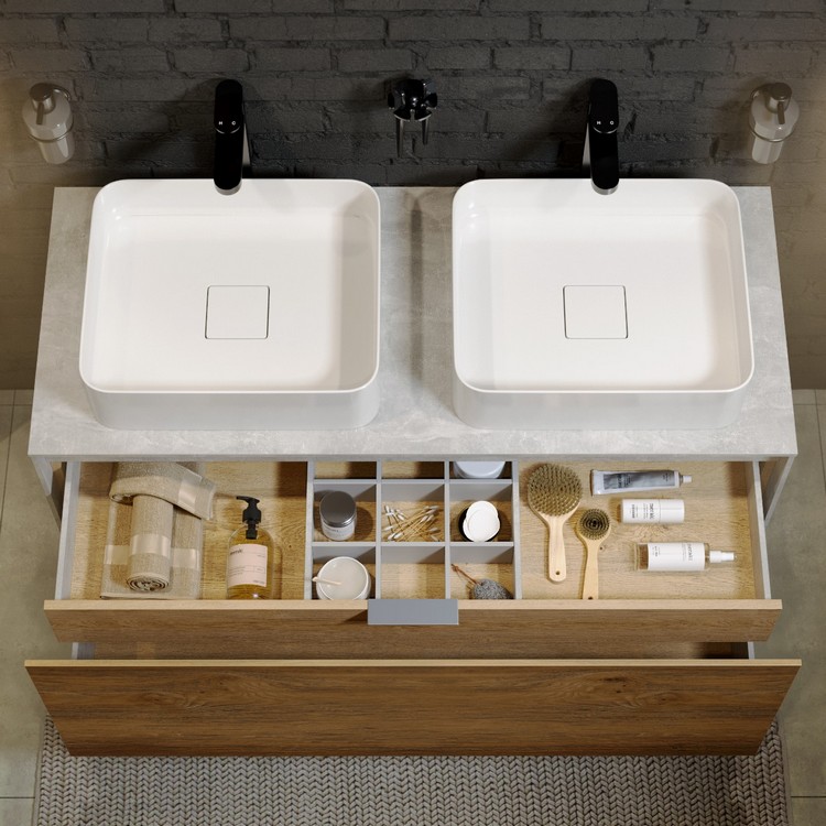Тумба Mobi 120 оснащена двумя ящиками: основным и внутренним, скрытым за фасадом. Направляющие ящиков обеспечивают плавное и мягкое закрывание. Внутренний ящик тумб укомплектован пластиковым разделителем для хранения различных мелочей. Внутренняя отделка ящиков комбинированная: боковины – цвет бетон светлый, дно – дуб балтийский. В комплект тумбы Mobi входит специальный сифон, позволяющий экономить пространство мебели. Фасады, боковины и столешницы из МДФ толщиной всего 10 мм. Подходит любой наставной умывальник. При этом умывальник может устанавливаться в любом месте, а не только центру. На данную тумбу также можно установить один умывальник. Коллекция оснащена итальянскими навесами Camar, которые выдерживают нагрузку до 200 кг.