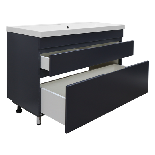 Тумба Эстима 100/2Н оснащена двумя выдвижными ящиками на доводчиках скрытого монтажа. Установлена на хромированные ножки. Корпус изготовлен из ЛДСП, фасады МДФ толщиной 16 мм. Корпус и фасады производства Kronospan. Бока и фасады крашеные итальянской эмалью.