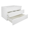 Тумба Эстима 80/2 оснащена двумя выдвижными ящиками на доводчиках скрытого монтажа. Корпус изготовлен из ЛДСП, фасады МДФ толщиной 16 мм. Корпус и фасады производства Kronospan. Бока и фасады крашеные итальянской эмалью.